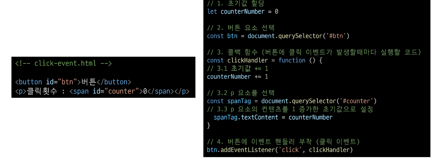 - event: 무언가 일어났다는 신호, 사건-모든 DOM 요소는 이러한 event를 만들어 냄