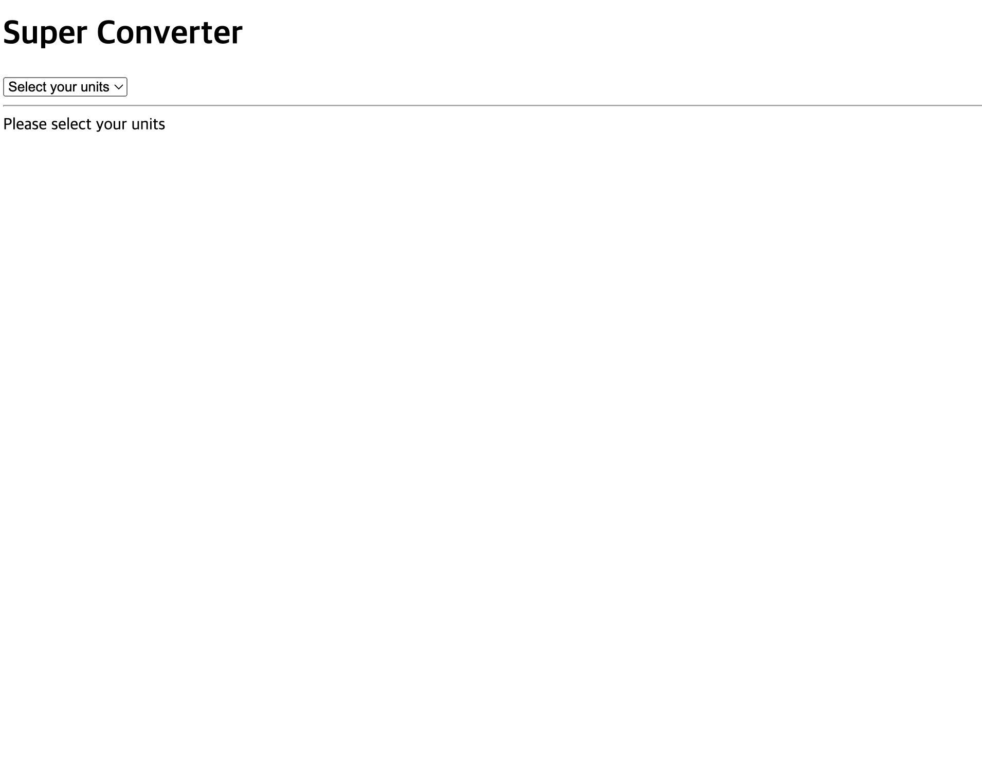 const onSelect=(event)=>{console.log(event.target.value);setIndex(event.target.value);}// //////////////return 영역return (<div><h1>Super Converter</h1><select value={index} onChange={onSelect}><option value="xx">Select your units</option><option value="0">Minutes&Hours</option><option value="1">Kim&Miles</option></select><hr/>{index ==="xx"? "Please select your units" : null}{index === "0" ? <MinutesToHours/> : null}{index === "1" ? <KmToMiles/> : null}</div>);}// root라는 id를 가진 div 요소에 React 컴포넌트를 렌더링ReactDOM.render(<App/>, root);