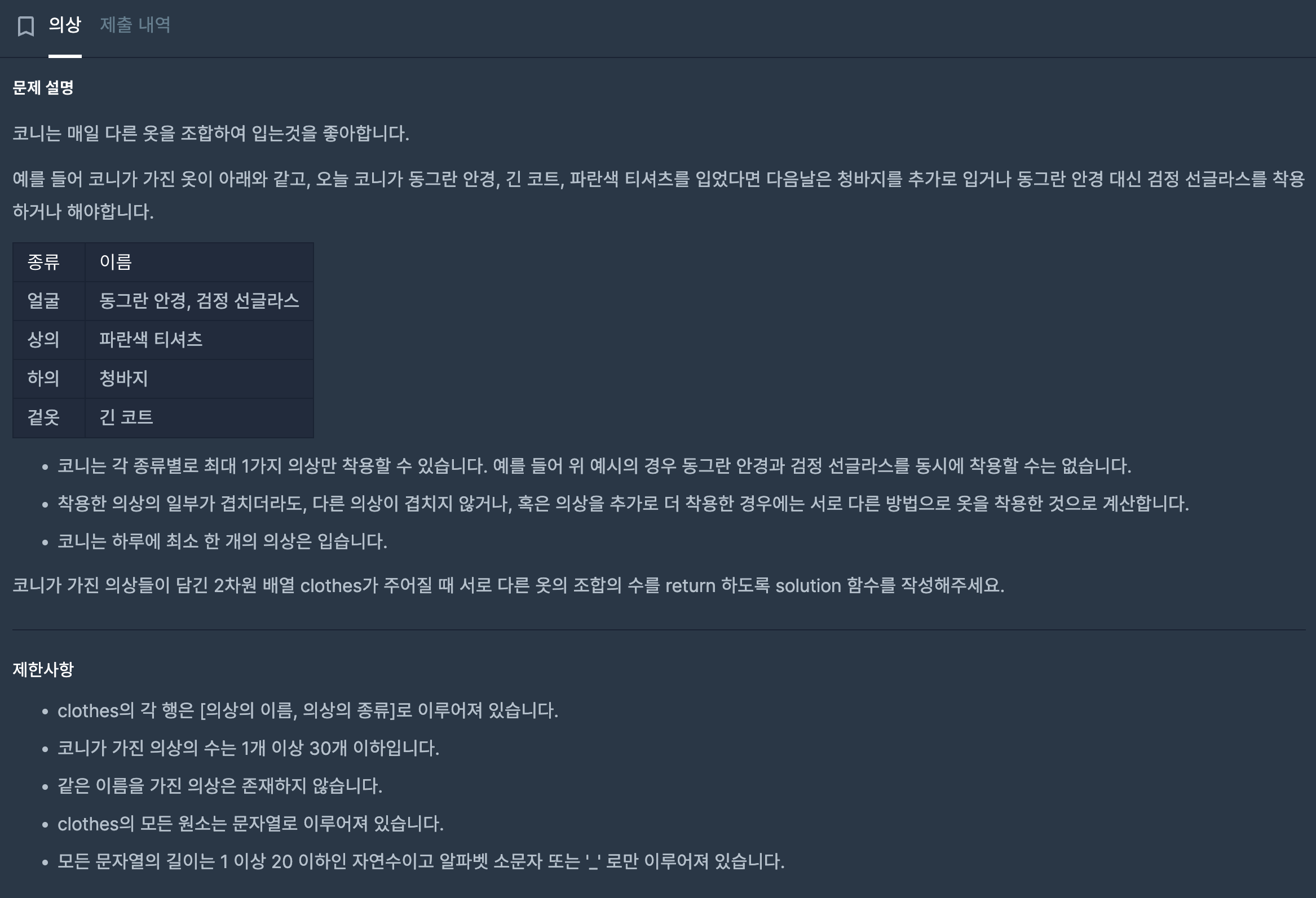 이때, 하루에 하나는 입어야 한다는 조건이 있으므로 모두 0을 선택한 1가지의 경우의수를 제외한 값이 answer가 된다.